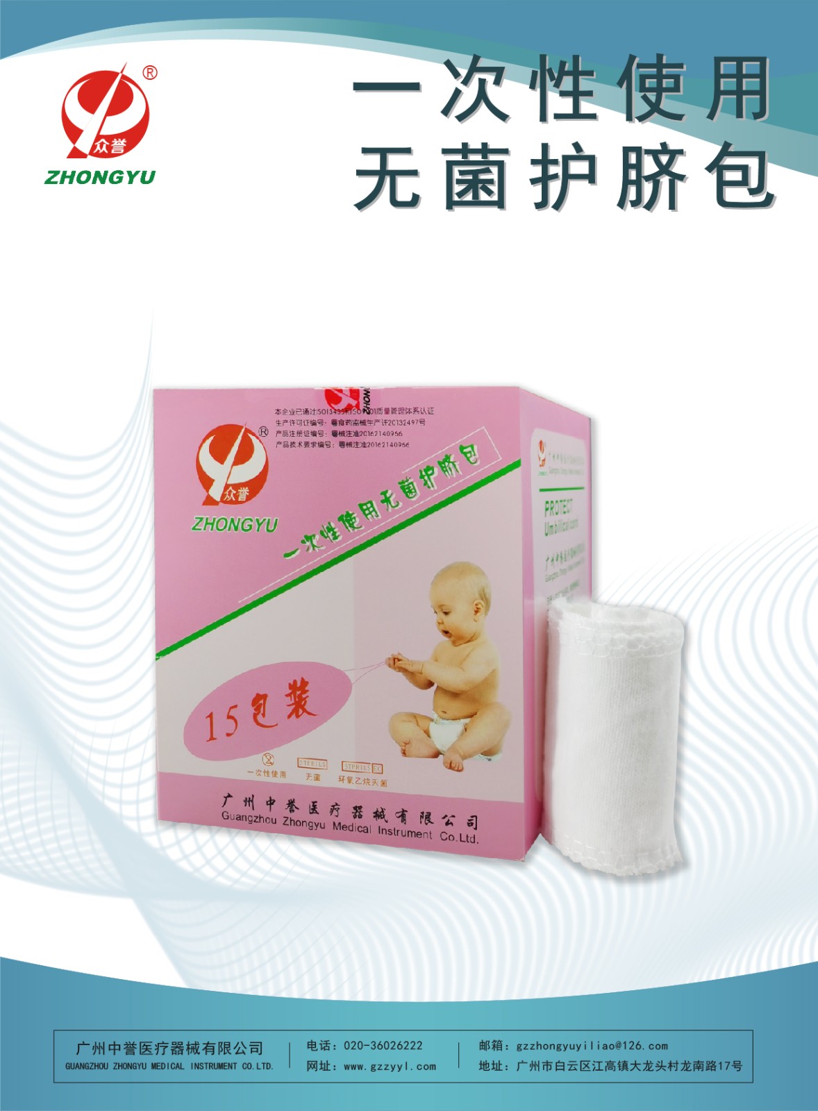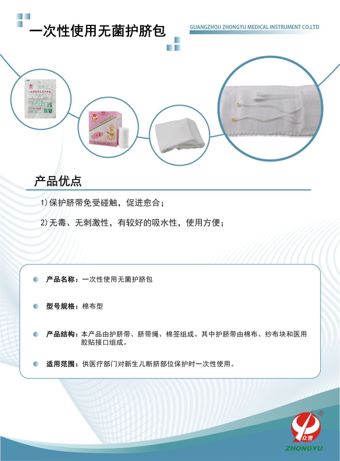 一次性使用无菌护脐包 产品型号:一次性使用无菌产包 产品规格:棉布型 产品描述:本产品由护脐带、脐带绳、棉签组成。其中护脐带由棉布、纱布块和医用胶贴接口组成。供医疗部门对新生儿断脐部位保护时一次性使用。 产品特点