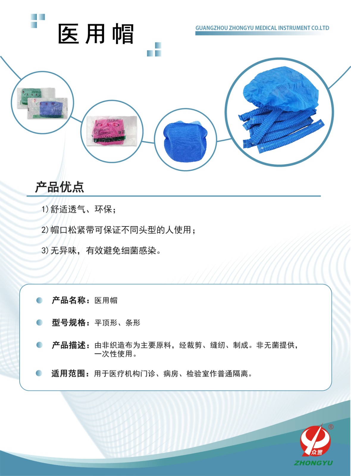 医用帽 医用帽 产品型号:医用帽 产品规格:平顶形、条形 产品描述:由非织造布为主要原料,经裁剪、缝纫、制成。非无菌提供,一次性使用。用于医疗机构门诊、病房、检验室作普通隔离。 产品特点 上一篇:一次性使用手术衣 下一篇:没有了