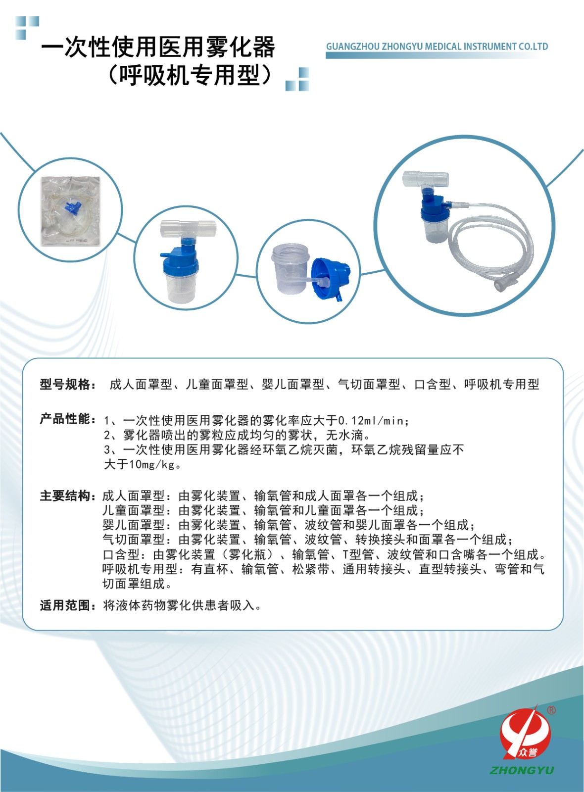 产品描述:本产品采用进口医用PP材质制造,主要由罩壳、固定带、输氧管等组成。成人面罩型:由雾化装置、输氧管和成人面罩各一个组成;儿童面罩型:由雾化装置、输氧管和儿童面罩各一个组成;婴儿面罩型:由雾化装置、输氧管、波纹管和婴儿面罩各一个组成;气切面罩型:由雾化装置、输氧管、波纹管、转换接头和面罩各一个组成;口含型:由雾化装置(雾化瓶)、输氧管、T型管、波纹管和口含嘴各一个组成。呼吸机专用型:有直杯、输氧管、松紧带、通用转接头、直型转接头、弯管和气切面罩组成。