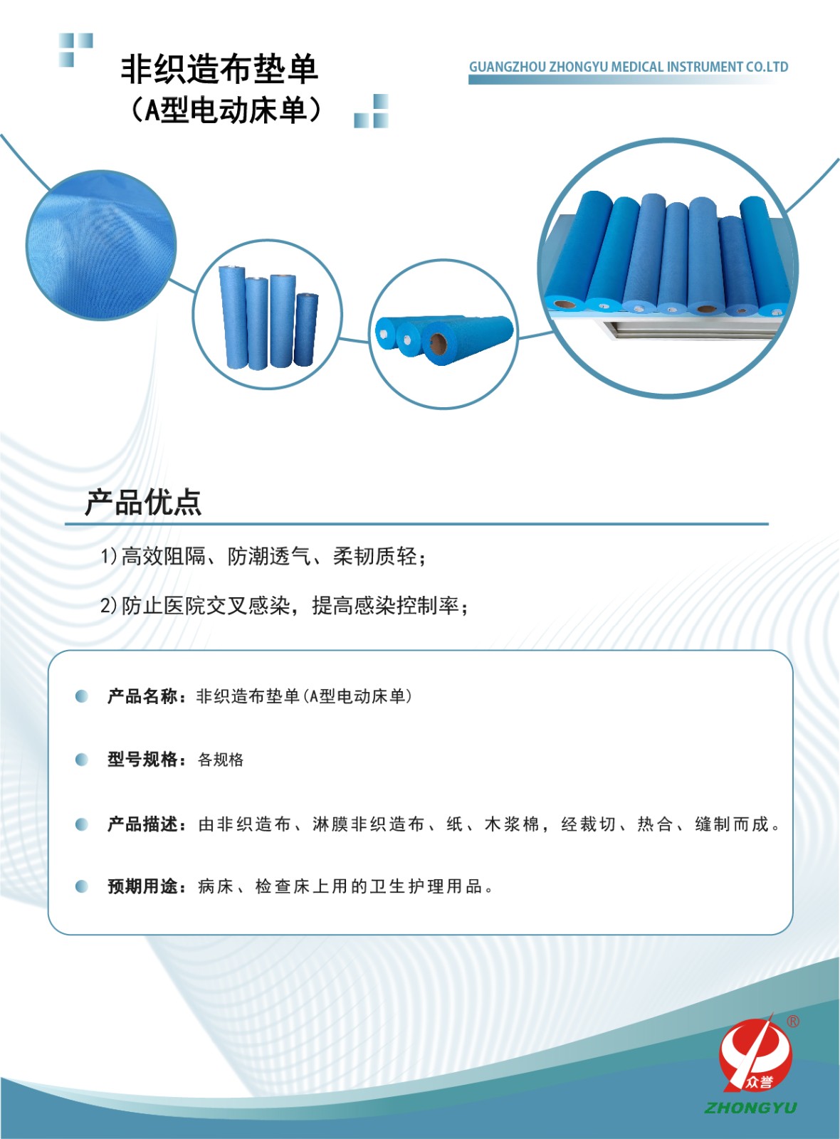 非织造布垫单 非织造布垫单 产品型号:A型(电动床单) 产品规格:各规格 产品描述:A型垫单由淋膜非织造布裁切加工制成。高效阻隔、防潮透气、柔韧质轻。防止医院交叉感染,提高感染控制率。 产品特点 上一篇:非织造布垫单 下一篇:没有了