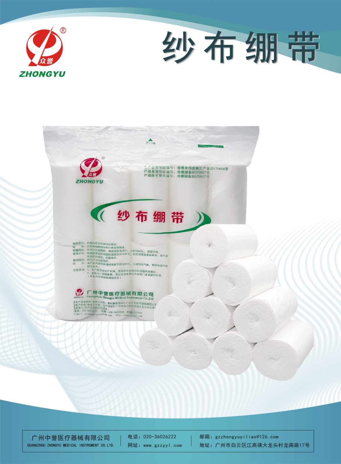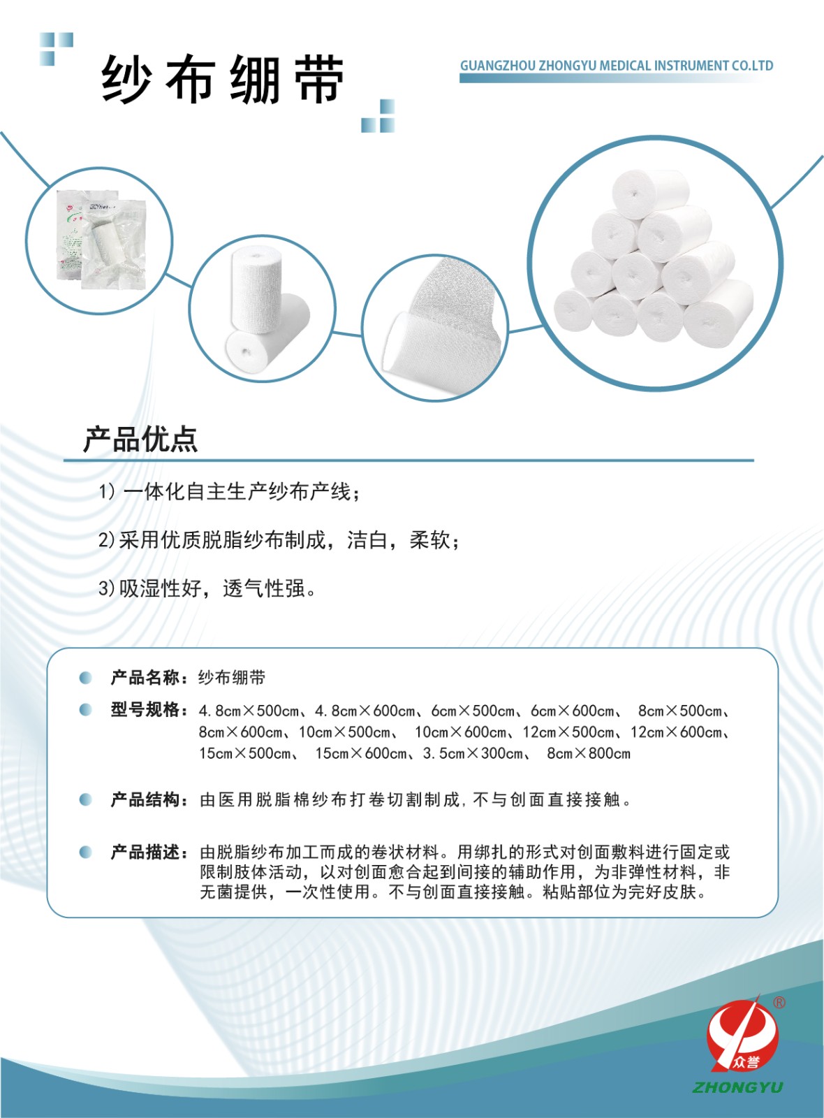 产品描述:由脱脂纱布加工而成的卷状的材料。用绑扎的形式对创面敷料进行固定或限制肢体活动,以对创面愈合起到间接的辅助作用。为非弹性材料,非无菌提供,一次性使用。不与创面直接接触。粘贴部位为完好皮肤。